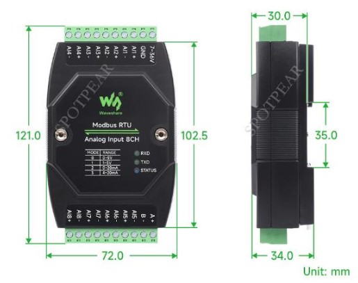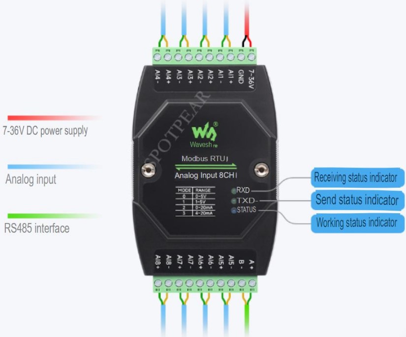 - Mode input dapat dipilih menggunakan konfigurasi MODE internal (kemungkinan via register Modbus atau dipilih melalui jumper/config switch).